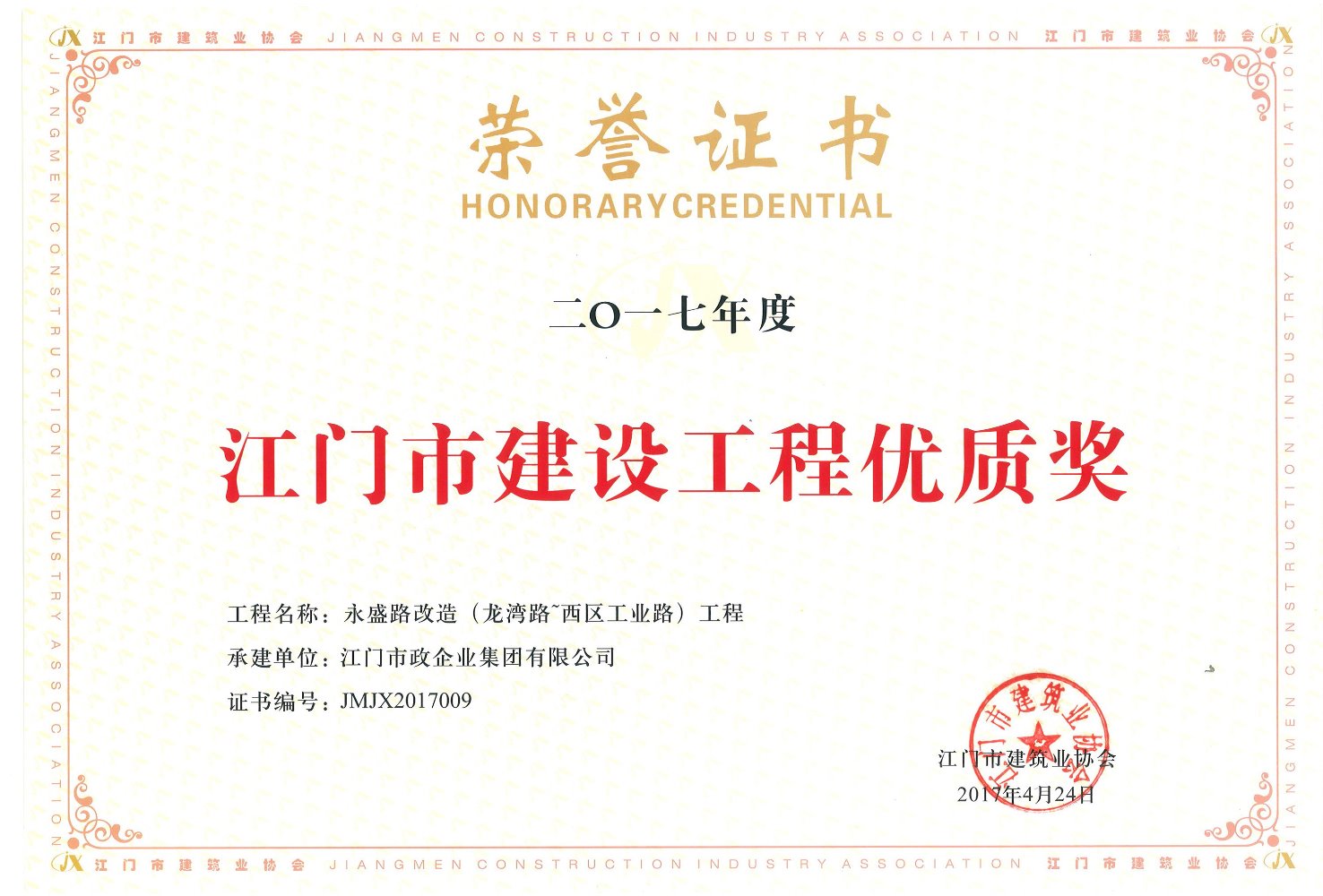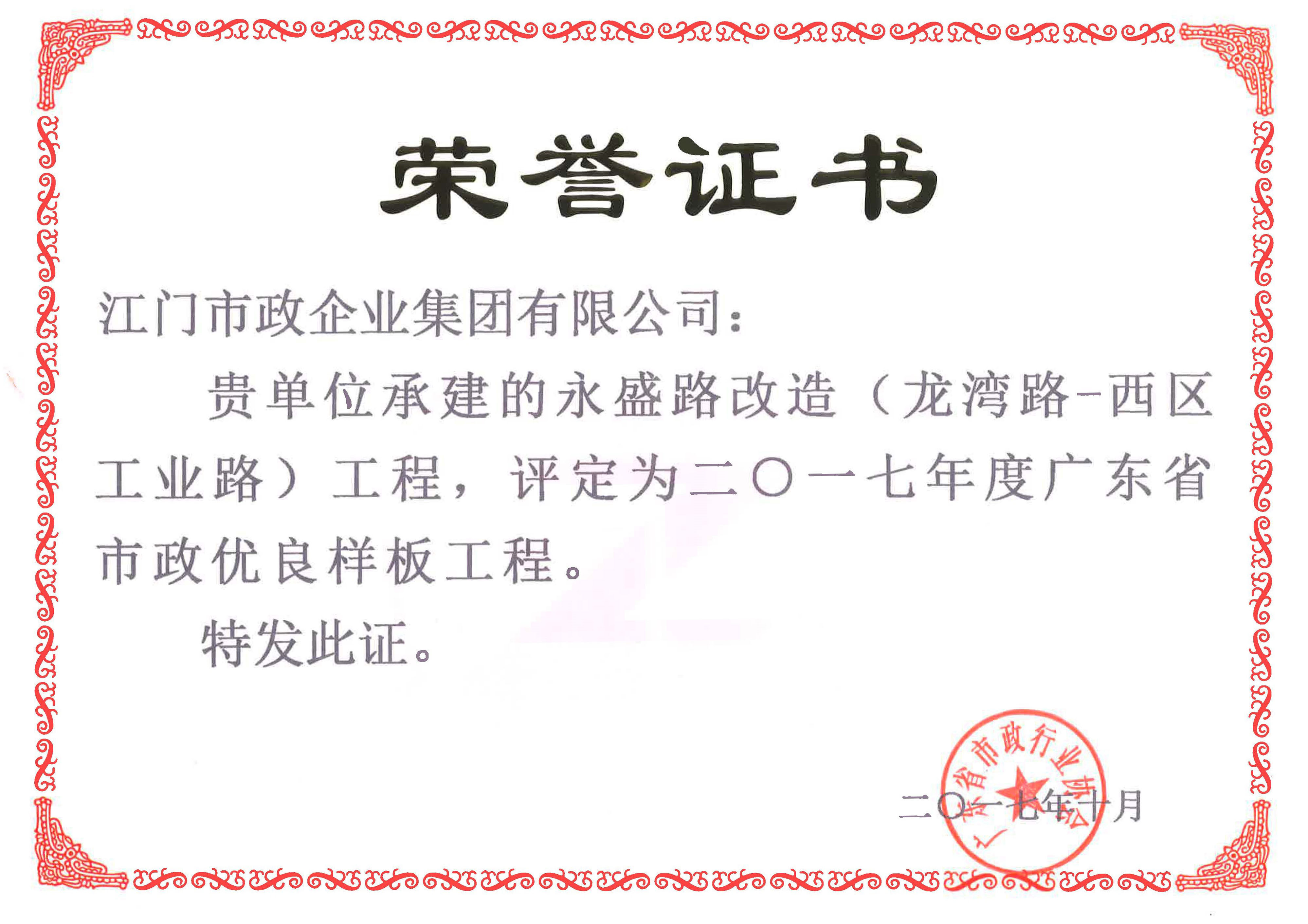 2017年度江門(mén)市建設(shè)工程優(yōu)質(zhì)獎(jiǎng)-永盛路改造(龍灣路~西區(qū)工業(yè)路)工程