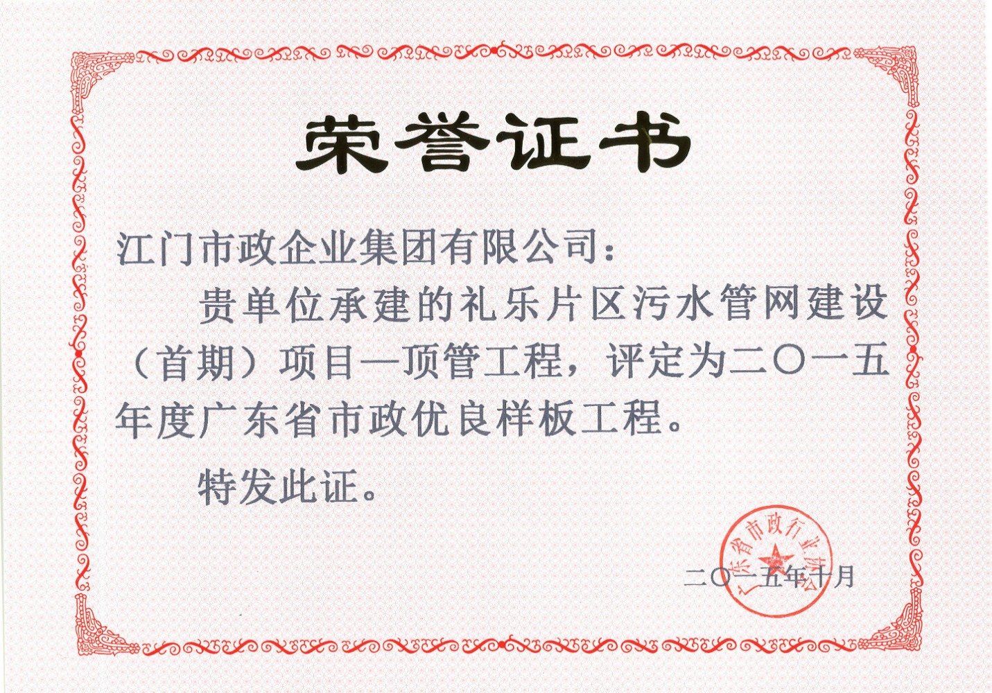 2015年省市政優(yōu)良樣板工程-禮樂(lè)片區(qū)污水管網(wǎng)建設(shè)(首期)項(xiàng)目-頂管工程(江門(mén)市
